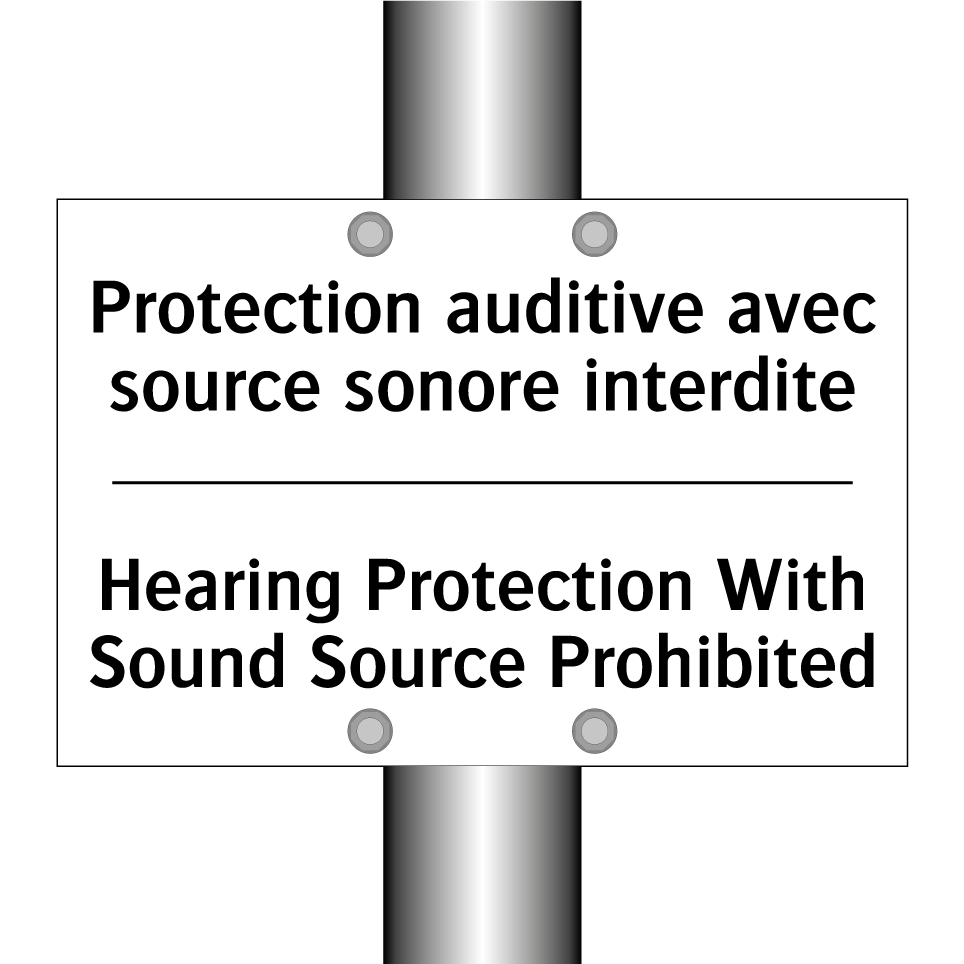 Panneau d'interdiction bilingue avec texte en français : "Protection auditive avec source sonore interdite", et en anglais : "Hearing Protection With Sound Source Prohibited"