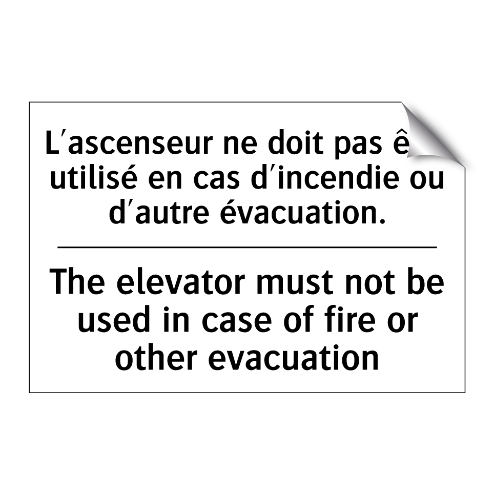 Panneau d'interdiction bilingue avec texte en français : "L'ascenseur ne doit pas être utilisé en cas d'incendie ou d'autre évacuation.", et en anglais : "The elevator must not be used in case of fire or other evacuation"
