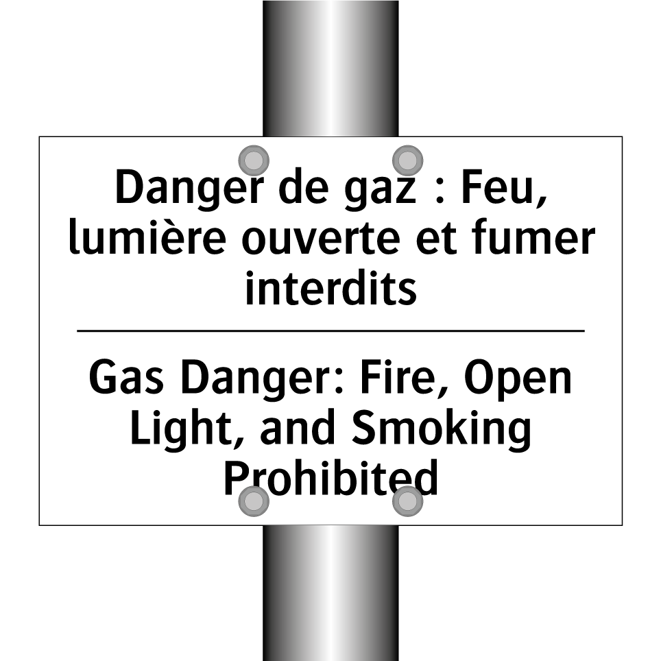 Panneau d'interdiction bilingue avec texte en français : "Danger de gaz : Feu, lumière ouverte et fumer interdits", et en anglais : "Gas Danger: Fire, Open Light, and Smoking Prohibited"