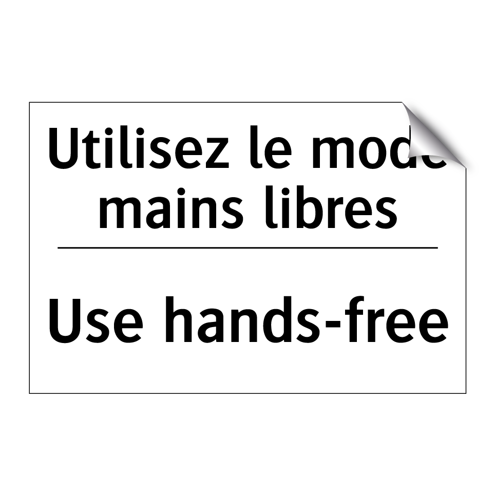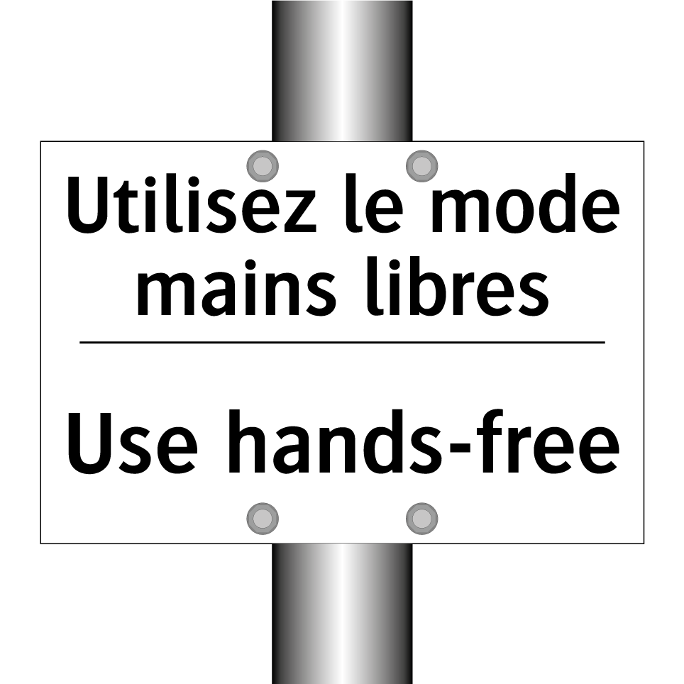 Panneau d'interdiction bilingue avec texte en français : "Utilisez le mode mains libres", et en anglais : "Use hands-free"