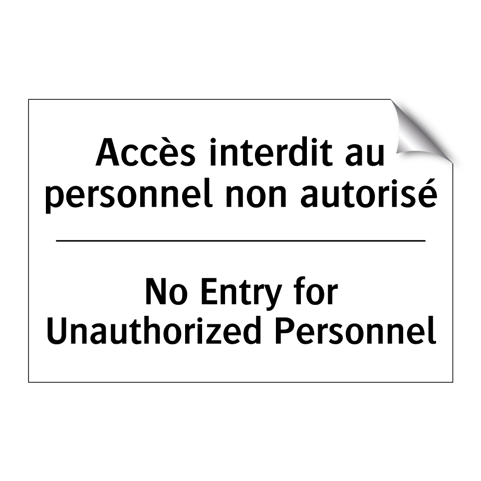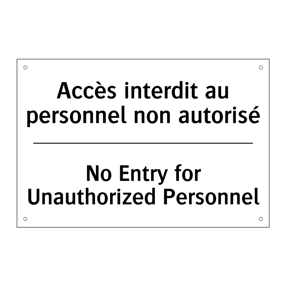 Panneau d'interdiction bilingue avec texte en français : "Accès interdit au personnel non autorisé", et en anglais : "No Entry for Unauthorized Personnel"