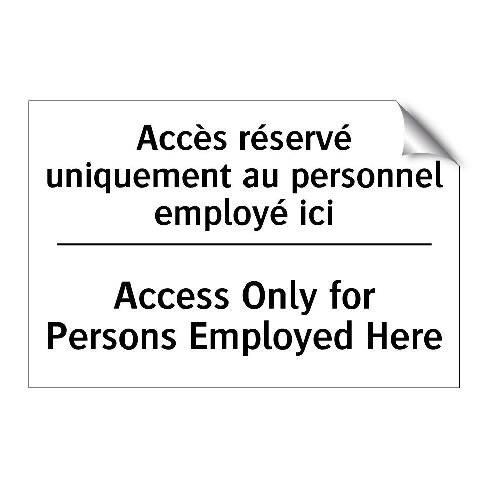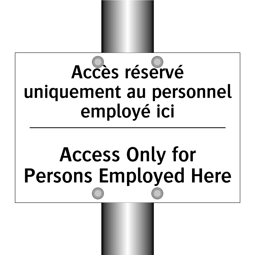 Panneau d'interdiction bilingue avec texte en français : "Accès réservé uniquement au personnel employé ici", et en anglais : "Access Only for Persons Employed Here"