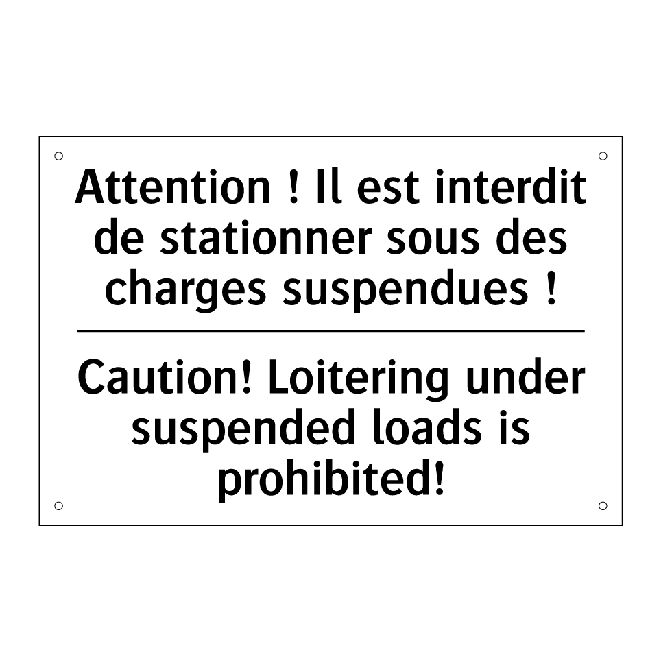 Panneau d'interdiction bilingue avec texte en français : "Attention ! Il est interdit de stationner sous des charges suspendues !", et en anglais : "Caution! Loitering under suspended loads is prohibited!"