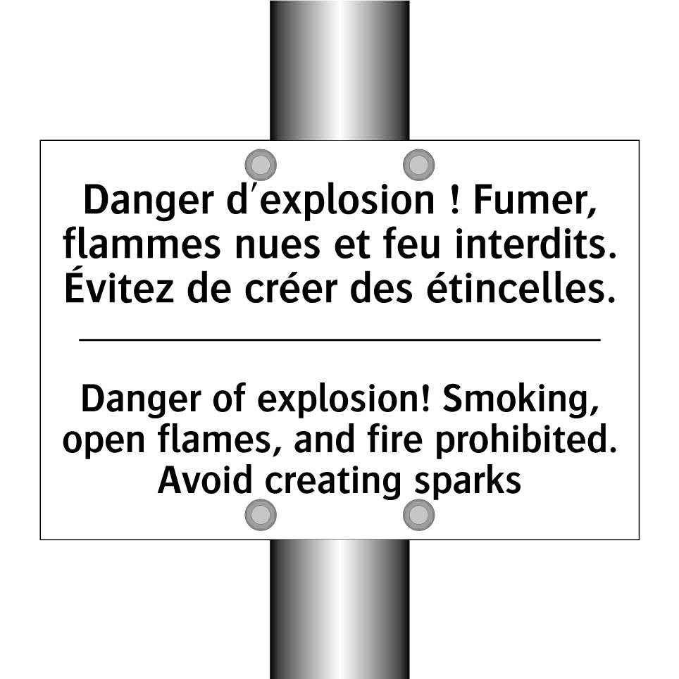 Panneau d'interdiction bilingue avec texte en français : "Danger d'explosion ! Fumer, flammes nues et feu interdits. Évitez de créer des étincelles.", et en anglais : "Danger of explosion! Smoking, open flames, and fire prohibited. Avoid creating sparks"
