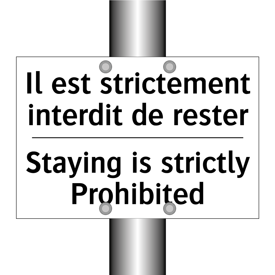 Panneau d'interdiction bilingue avec texte en français : "Il est strictement interdit de rester", et en anglais : "Staying is strictly Prohibited"