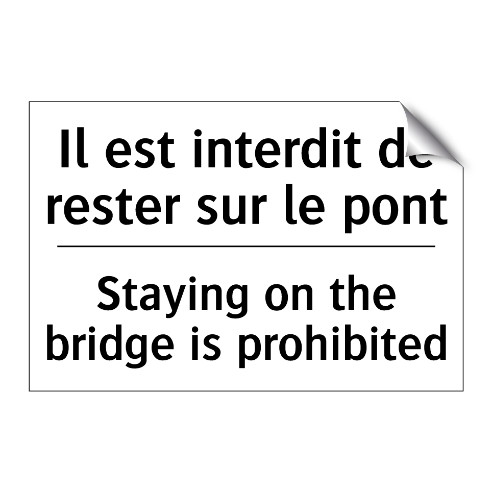 Panneau d'interdiction bilingue avec texte en français : "Il est interdit de rester sur le pont", et en anglais : "Staying on the bridge is prohibited"