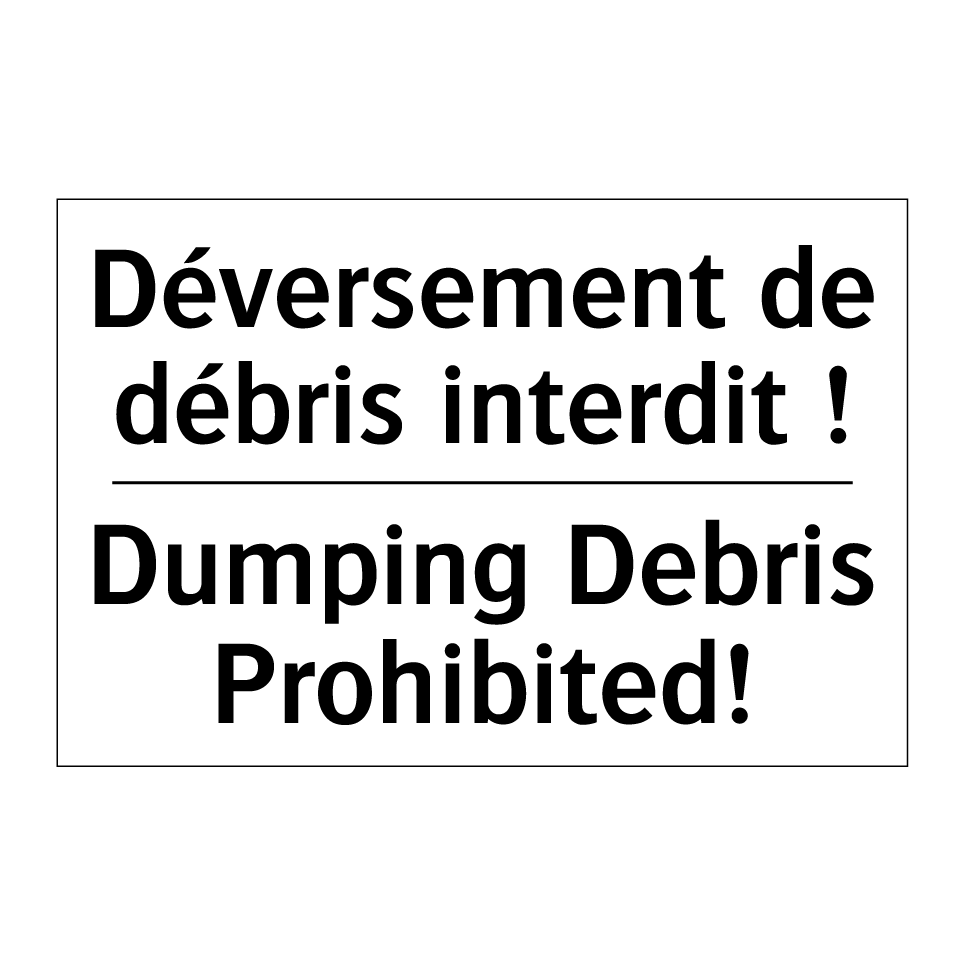 Panneau d'interdiction bilingue avec texte en français : "Déversement de débris interdit !", et en anglais : "Dumping Debris Prohibited!"