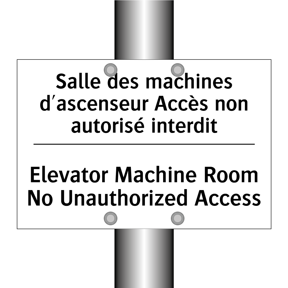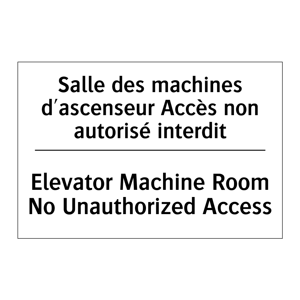 Panneau d'interdiction bilingue avec texte en français : "Salle des machines d'ascenseur Accès non autorisé interdit", et en anglais : "Elevator Machine Room No Unauthorized Access"