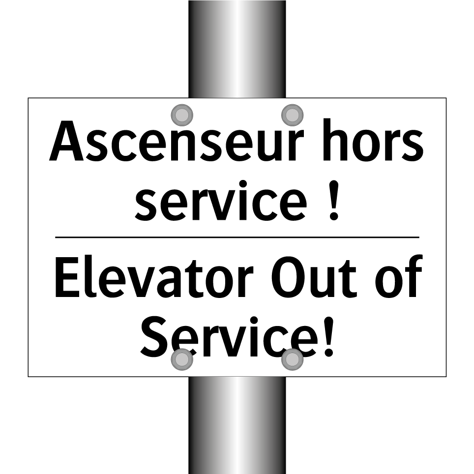 Panneau d'interdiction bilingue avec texte en français : "Ascenseur hors service !", et en anglais : "Elevator Out of Service!"