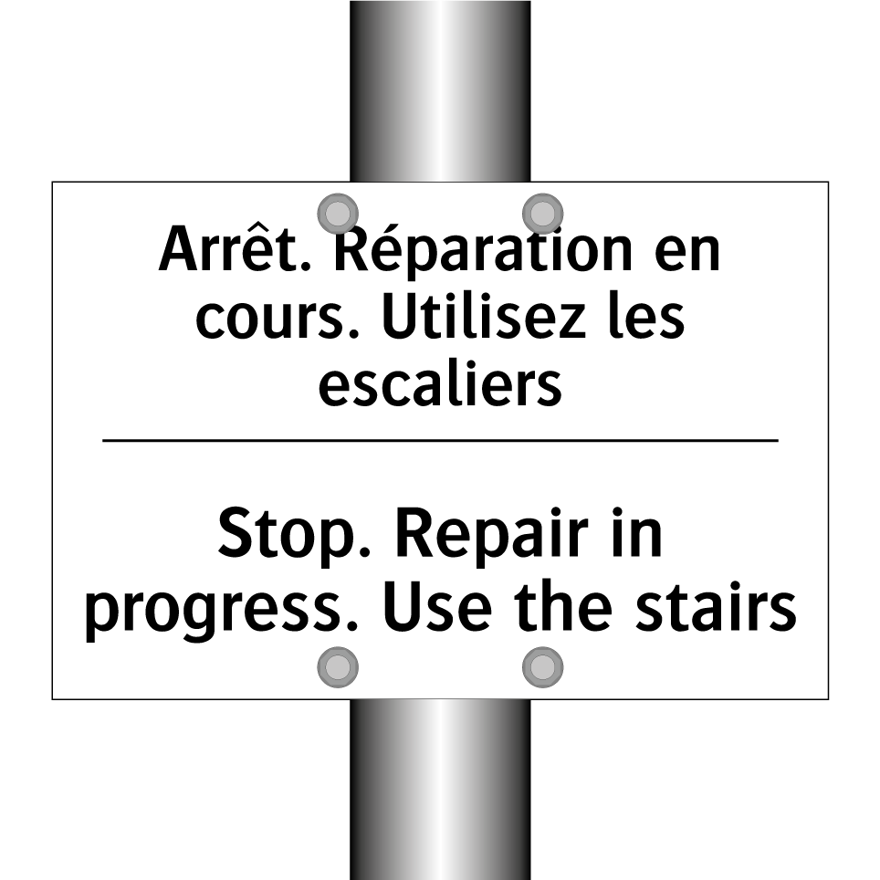 Panneau d'interdiction bilingue avec texte en français : "Arrêt. Réparation en cours. Utilisez les escaliers", et en anglais : "Stop. Repair in progress. Use the stairs"