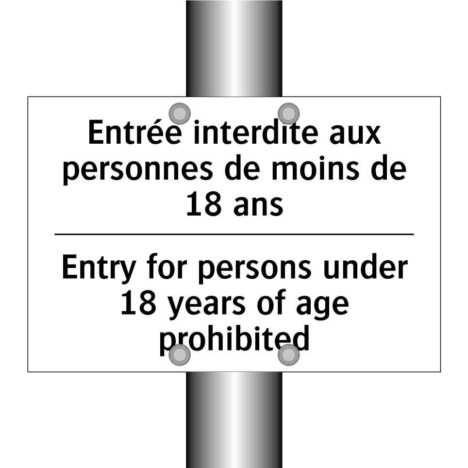 Panneau d'interdiction bilingue avec texte en français : "Entrée interdite aux personnes de moins de 18 ans", et en anglais : "Entry for persons under 18 years of age prohibited"