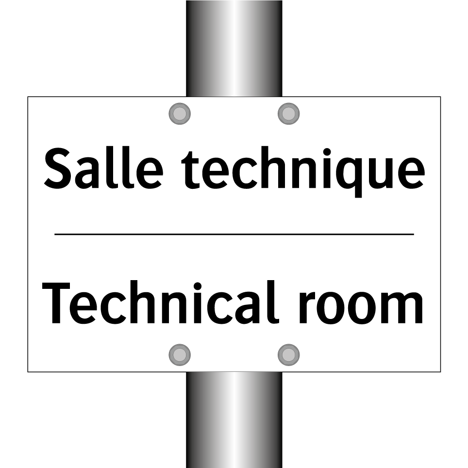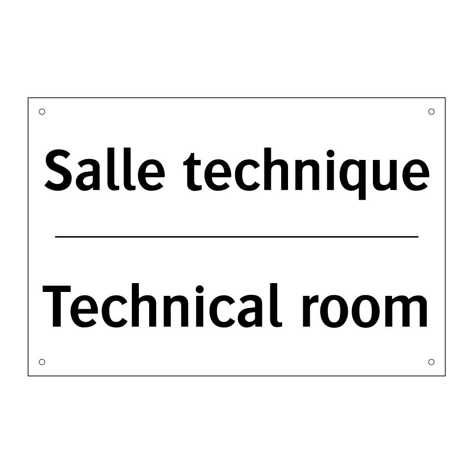 Panneau d'interdiction bilingue avec texte en français : "Salle technique", et en anglais : "Technical room"