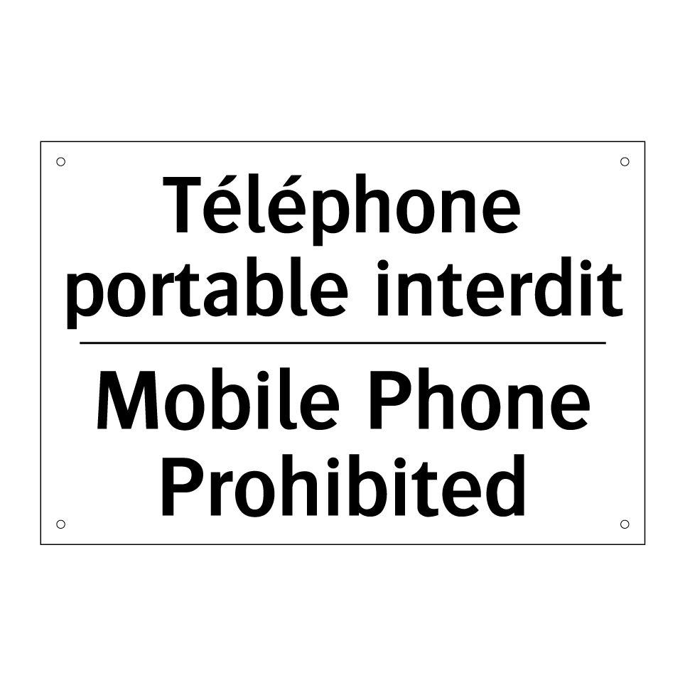 Panneau d'interdiction bilingue avec texte en français : "Téléphone portable interdit", et en anglais : "Mobile Phone Prohibited"
