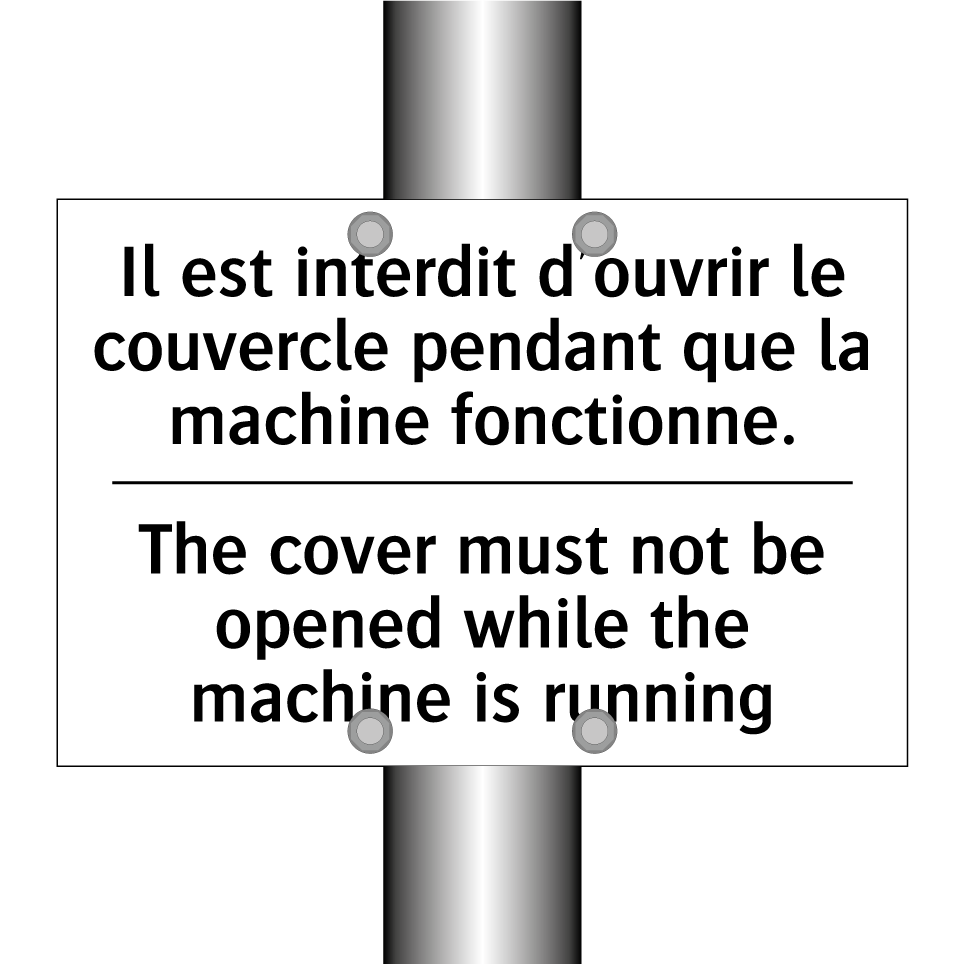 Panneau d'interdiction bilingue avec texte en français : "Il est interdit d'ouvrir le couvercle pendant que la machine fonctionne.", et en anglais : "The cover must not be opened while the machine is running"