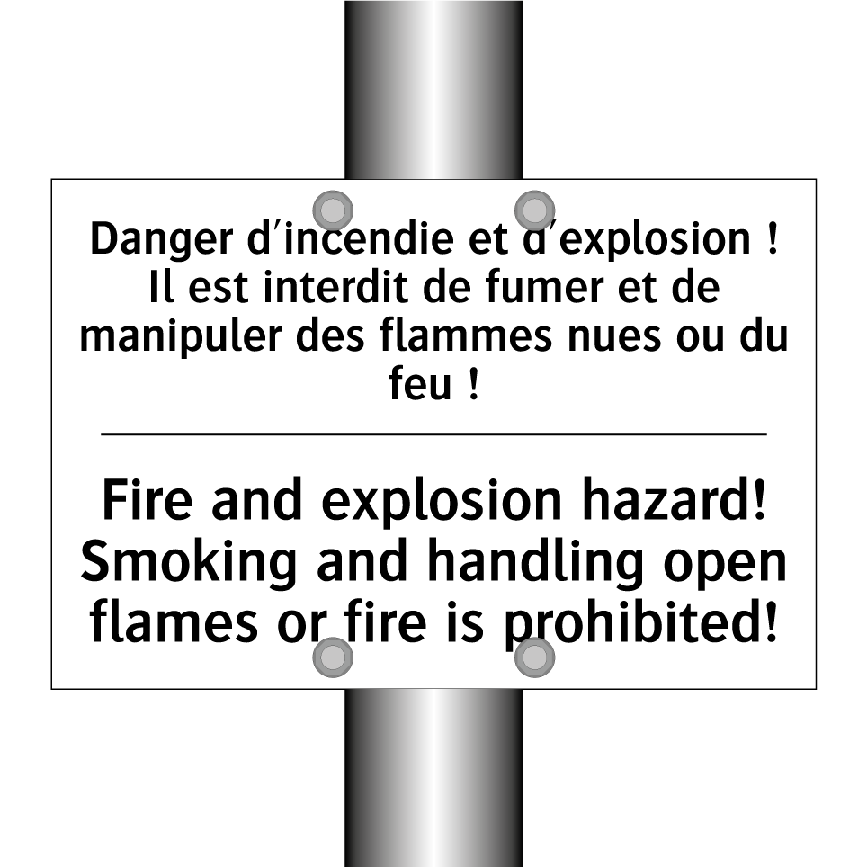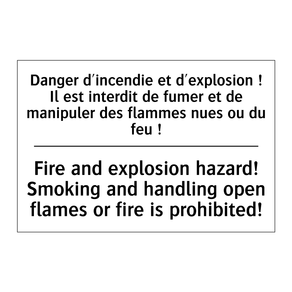 Panneau d'interdiction bilingue avec texte en français : "Danger d'incendie et d'explosion ! Il est interdit de fumer et de manipuler des flammes nues ou du feu !", et en anglais : "Fire and explosion hazard! Smoking and handling open flames or fire is prohibited!"