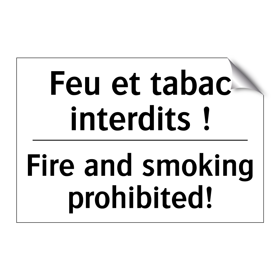 Panneau d'interdiction bilingue avec texte en français : "Feu et tabac interdits !", et en anglais : "Fire and smoking prohibited!"