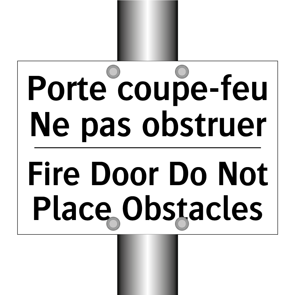 Panneau d'interdiction bilingue avec texte en français : "Porte coupe-feu Ne pas obstruer", et en anglais : "Fire Door Do Not Place Obstacles"