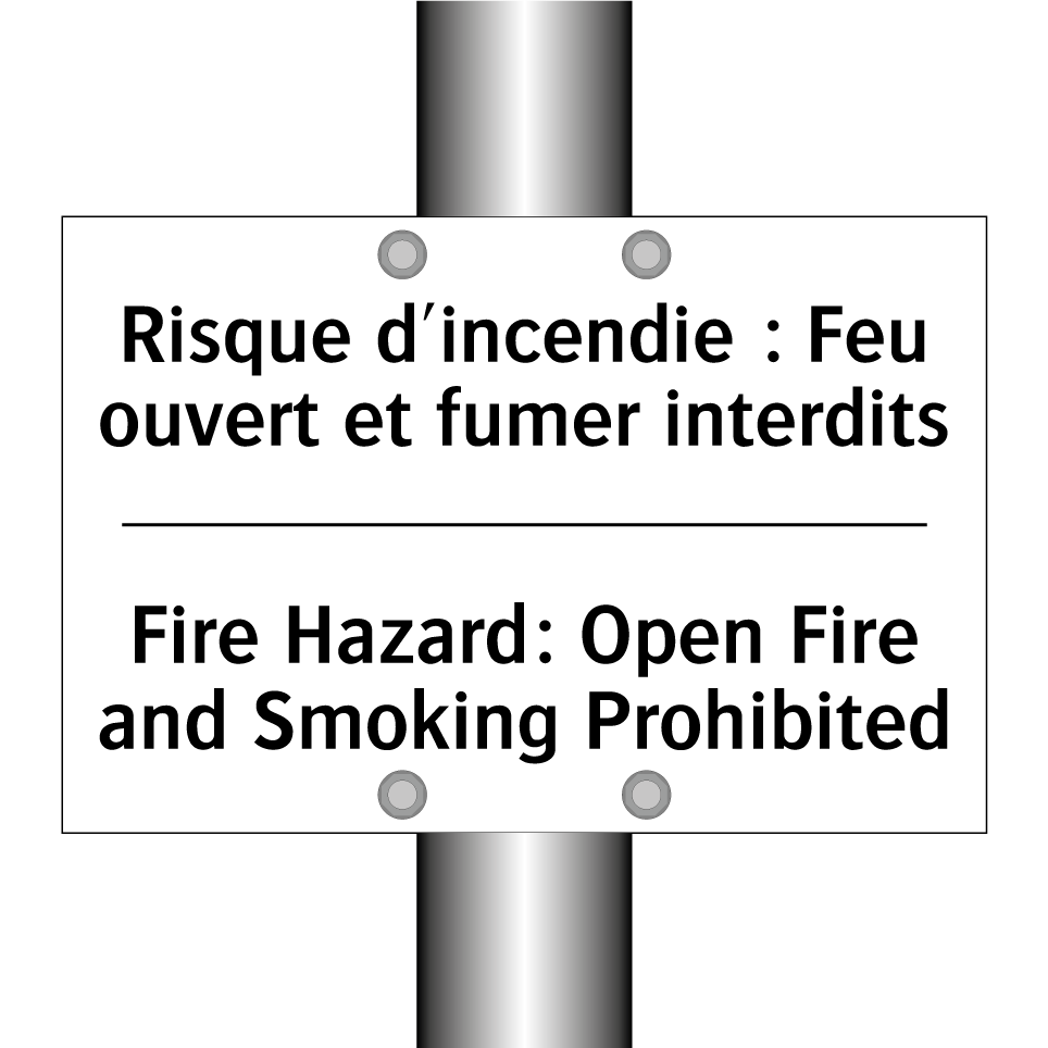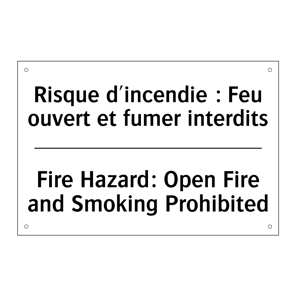 Panneau d'interdiction bilingue avec texte en français : "Risque d'incendie : Feu ouvert et fumer interdits", et en anglais : "Fire Hazard: Open Fire and Smoking Prohibited"
