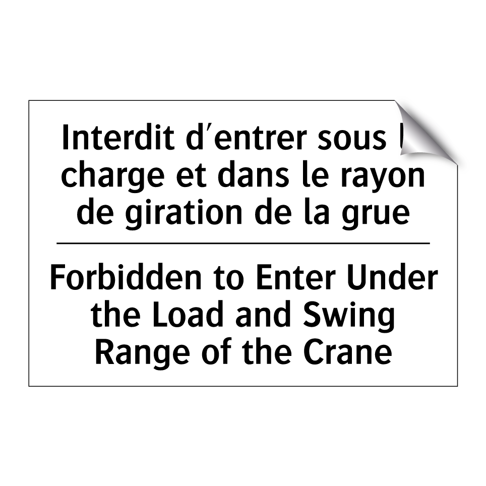 Panneau d'interdiction bilingue avec texte en français : "Interdit d'entrer sous la charge et dans le rayon de giration de la grue", et en anglais : "Forbidden to Enter Under the Load and Swing Range of the Crane"