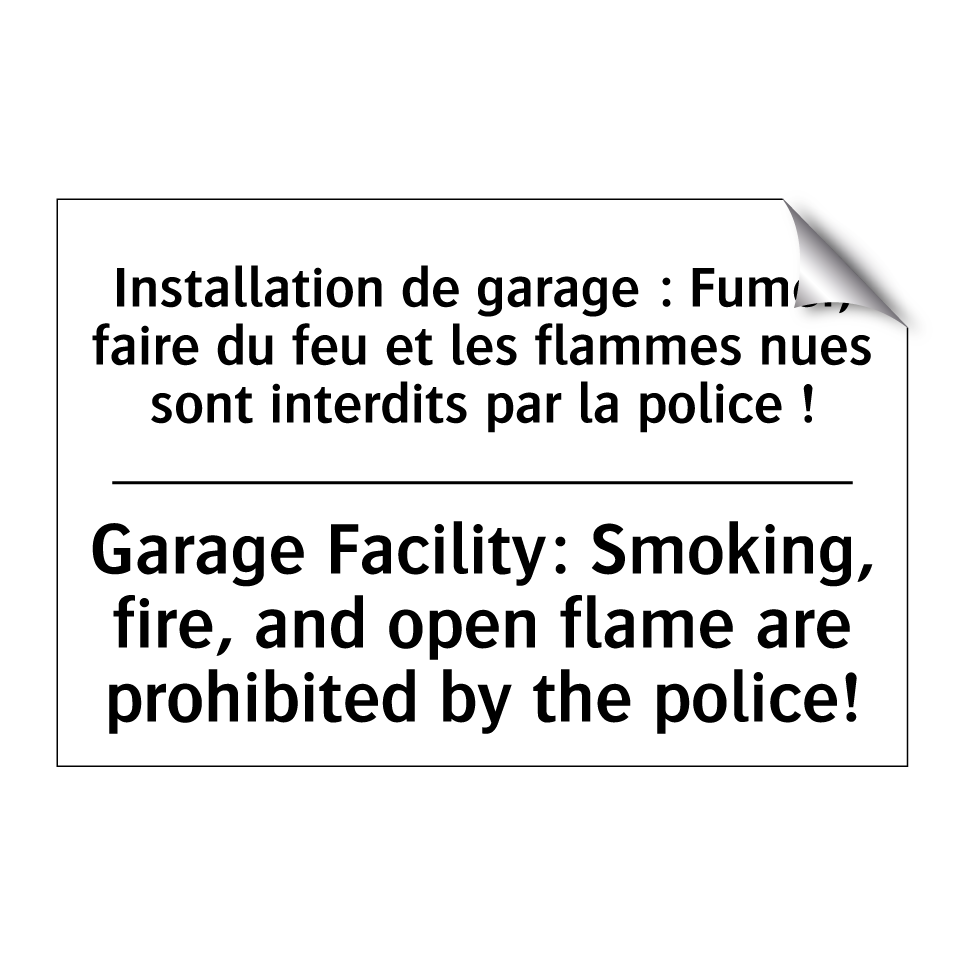 Panneau d'interdiction bilingue avec texte en français : "Installation de garage : Fumer, faire du feu et les flammes nues sont interdits par la police !", et en anglais : "Garage Facility: Smoking, fire, and open flame are prohibited by the police!"
