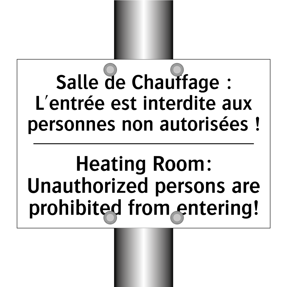 Panneau d'interdiction bilingue avec texte en français : "Salle de Chauffage : L'entrée est interdite aux personnes non autorisées !", et en anglais : "Heating Room: Unauthorized persons are prohibited from entering!"