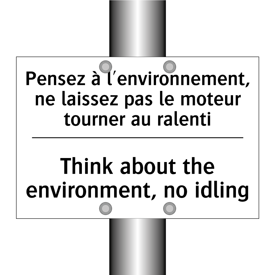 Panneau d'interdiction bilingue avec texte en français : "Pensez à l'environnement, ne laissez pas le moteur tourner au ralenti", et en anglais : "Think about the environment, no idling"