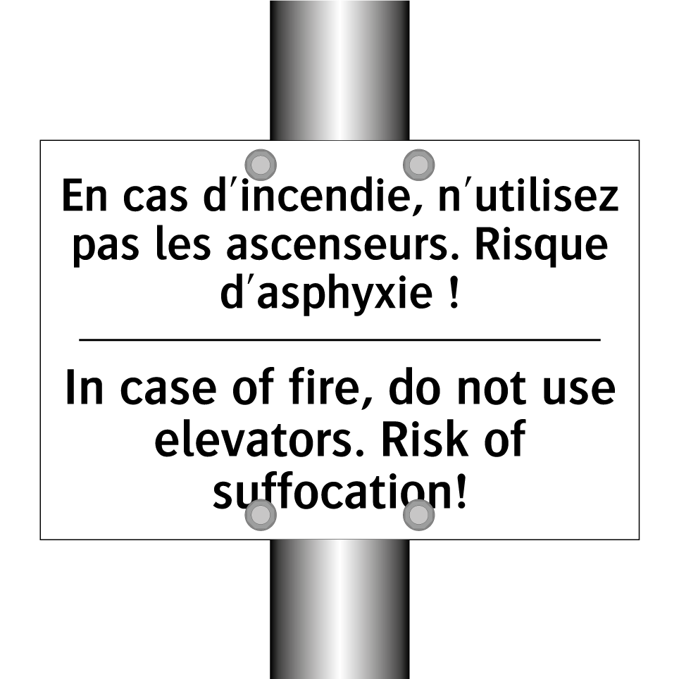 Panneau d'interdiction bilingue avec texte en français : "En cas d'incendie, n'utilisez pas les ascenseurs. Risque d'asphyxie !", et en anglais : "In case of fire, do not use elevators. Risk of suffocation!"