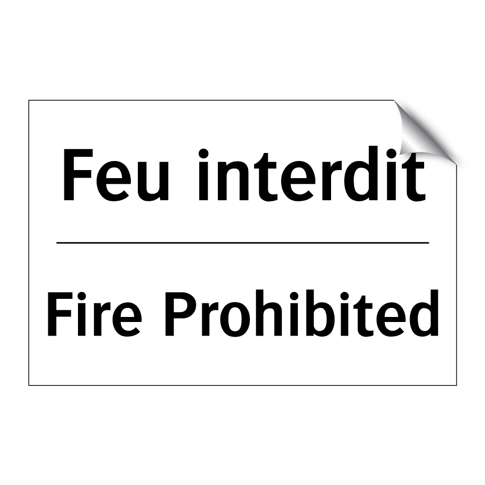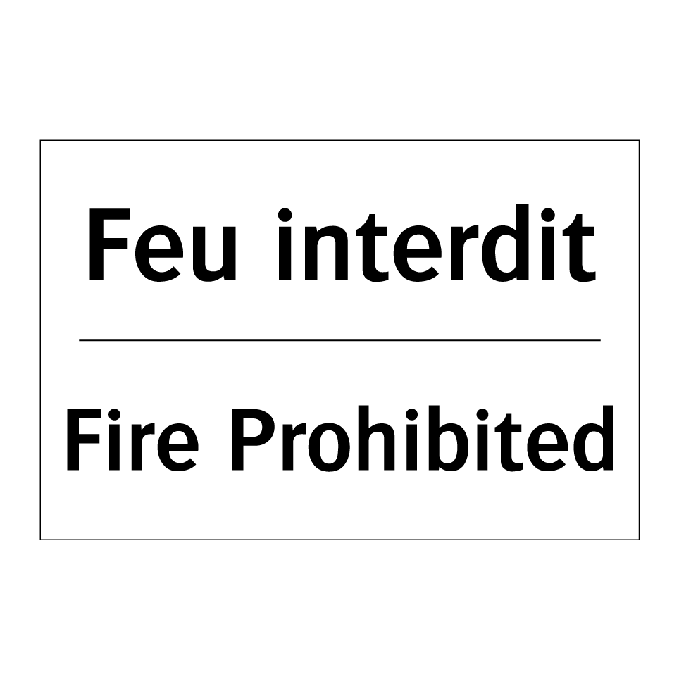 Panneau d'interdiction bilingue avec texte en français : "Feu interdit", et en anglais : "Fire Prohibited"