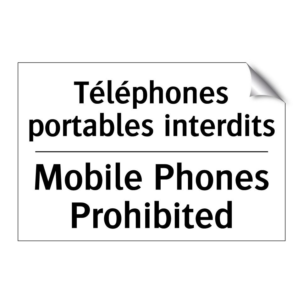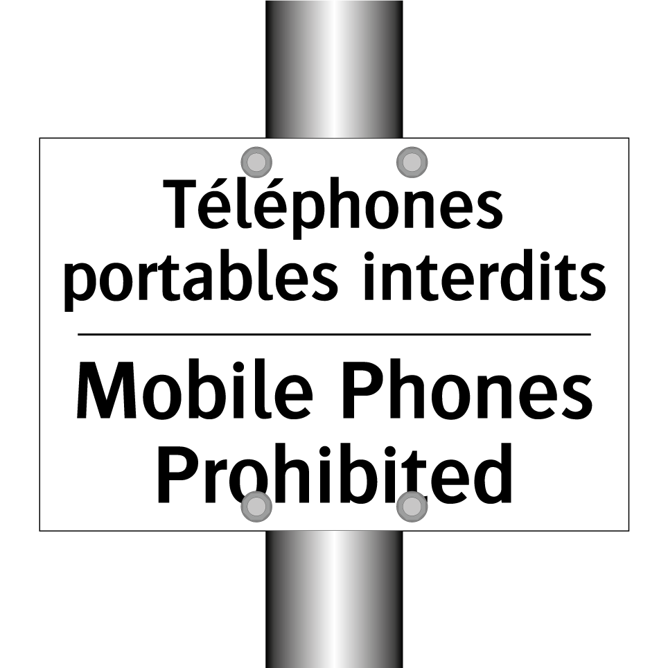 Panneau d'interdiction bilingue avec texte en français : "Téléphones portables interdits", et en anglais : "Mobile Phones Prohibited"