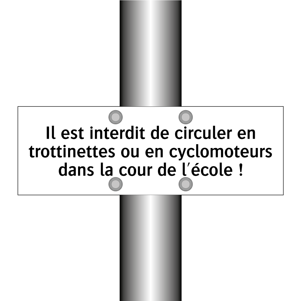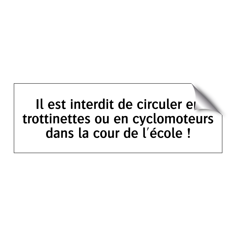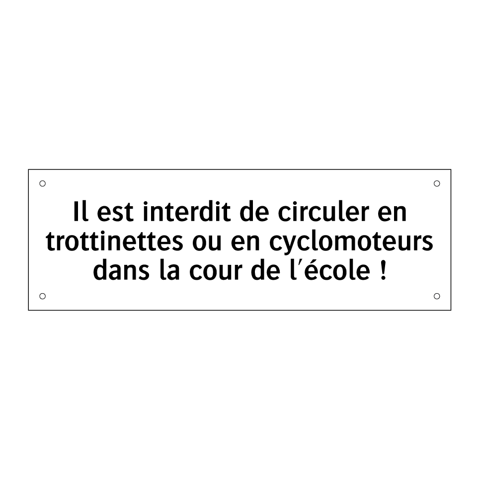 Panneau d'interdiction avec le texte : "Il est interdit de circuler en trottinettes ou en cyclomoteurs dans la cour de l'école !"