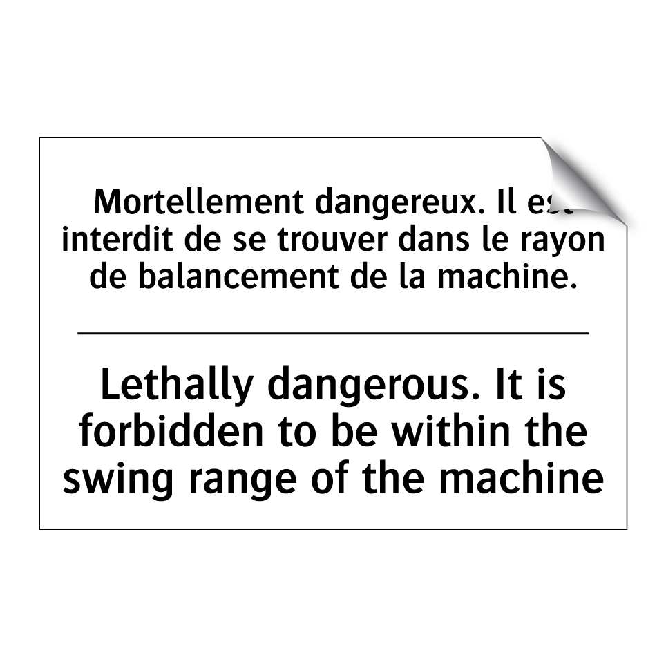 Panneau d'interdiction bilingue avec texte en français : "Mortellement dangereux. Il est interdit de se trouver dans le rayon de balancement de la machine.", et en anglais : "Lethally dangerous. It is forbidden to be within the swing range of the machine"