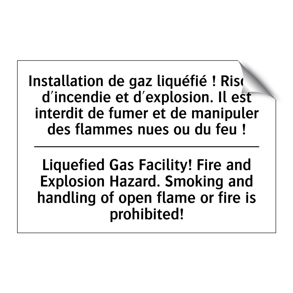 Panneau d'interdiction bilingue avec texte en français : "Installation de gaz liquéfié ! Risque d'incendie et d'explosion. Il est interdit de fumer et de manipuler des flammes nues ou du feu !", et en anglais : "Liquefied Gas Facility! Fire and Explosion Hazard. Smoking and handling of open flame or fire is prohibited!"