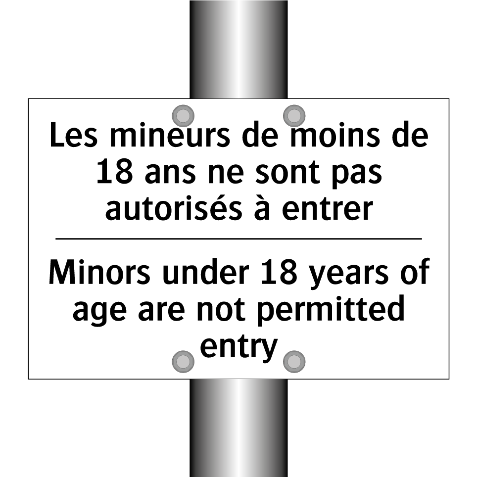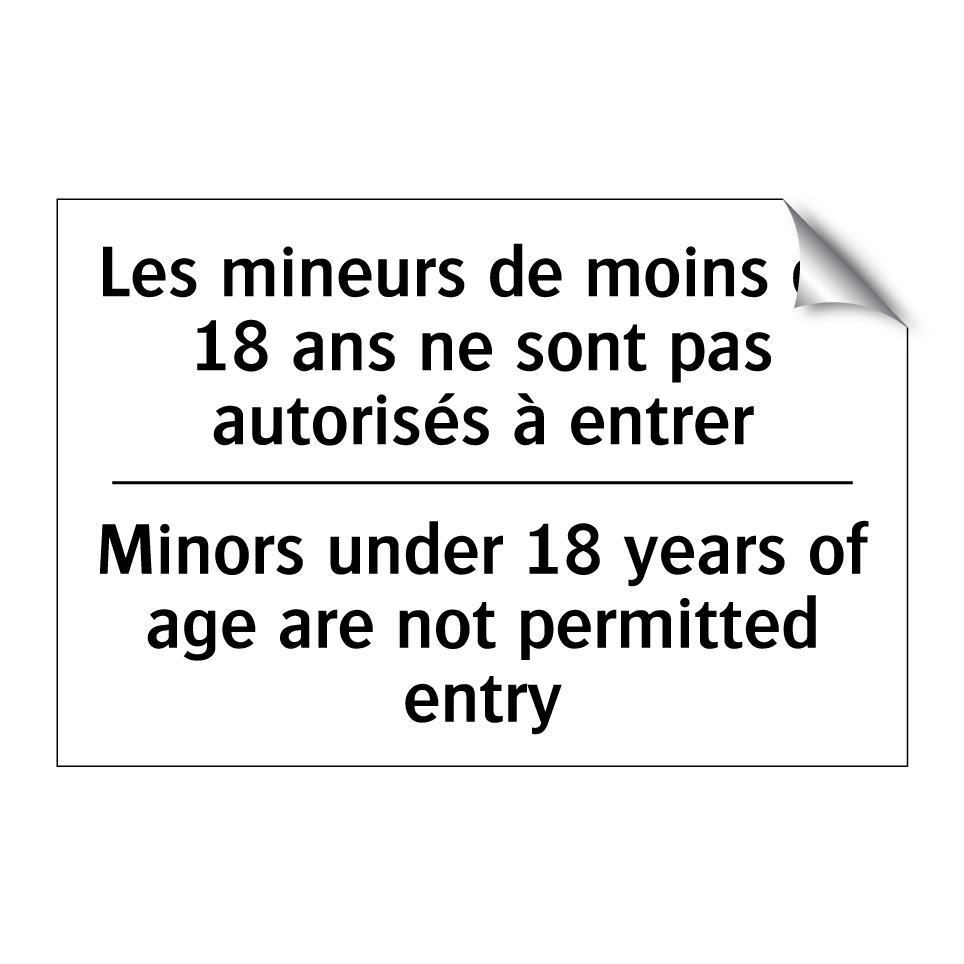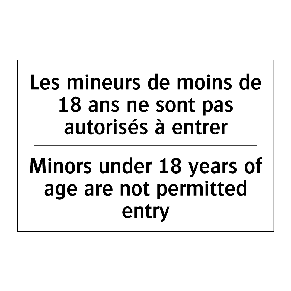 Panneau d'interdiction bilingue avec texte en français : "Les mineurs de moins de 18 ans ne sont pas autorisés à entrer", et en anglais : "Minors under 18 years of age are not permitted entry"
