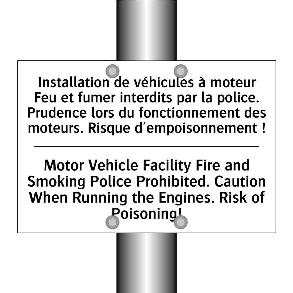 Panneau d'interdiction bilingue avec texte en français : "Installation de véhicules à moteur Feu et fumer interdits par la police. Prudence lors du fonctionnement des moteurs. Risque d'empoisonnement !", et en anglais : "Motor Vehicle Facility Fire and Smoking Police Prohibited. Caution When Running the Engines. Risk of Poisoning!"