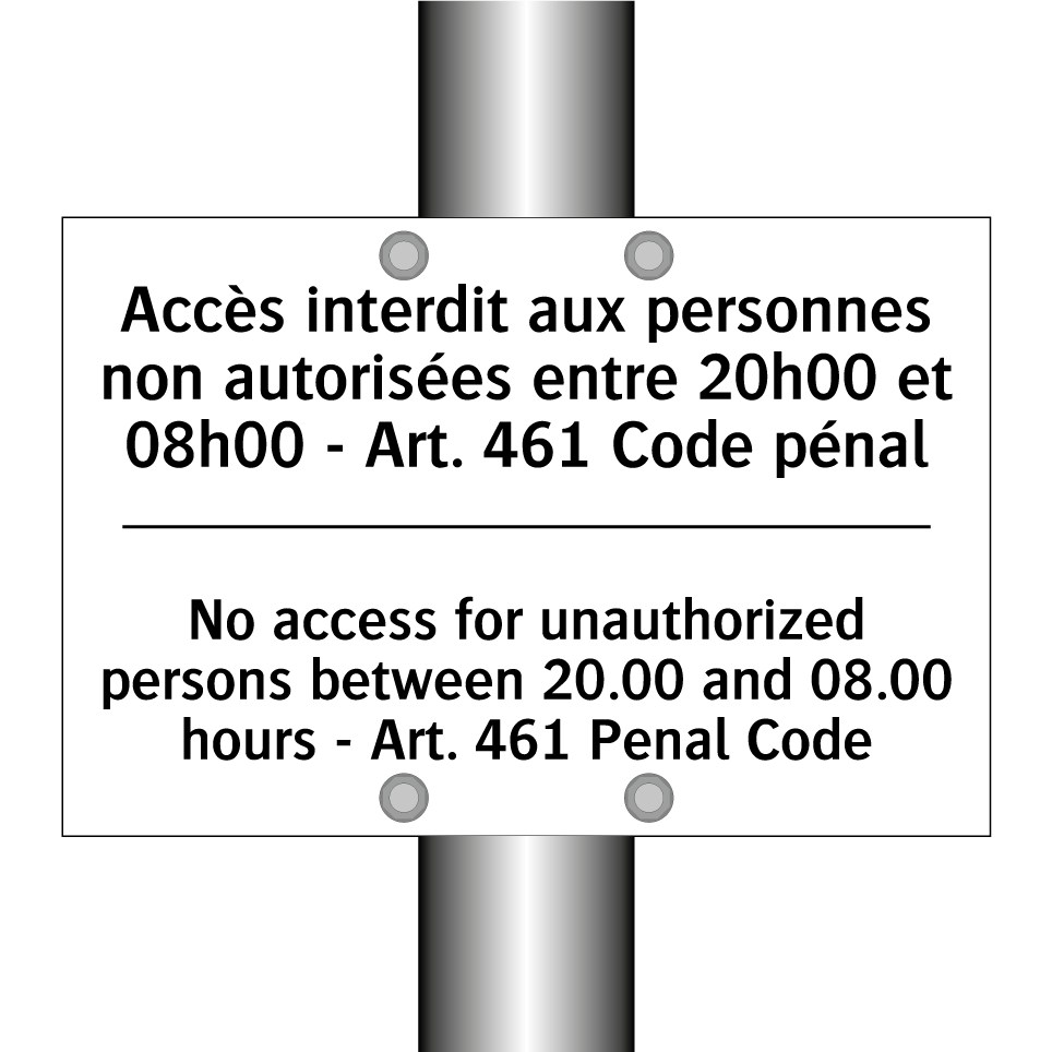 Panneau d'interdiction bilingue avec texte en français : "Accès interdit aux personnes non autorisées entre 20h00 et 08h00 - Art. 461 Code pénal", et en anglais : "No access for unauthorized persons between 20.00 and 08.00 hours - Art. 461 Penal Code"