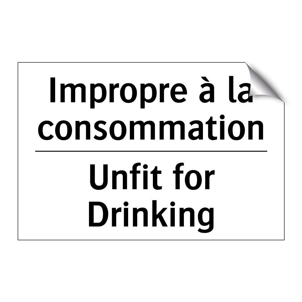 Panneau d'interdiction bilingue avec texte en français : "Impropre à la consommation", et en anglais : "Unfit for Drinking"