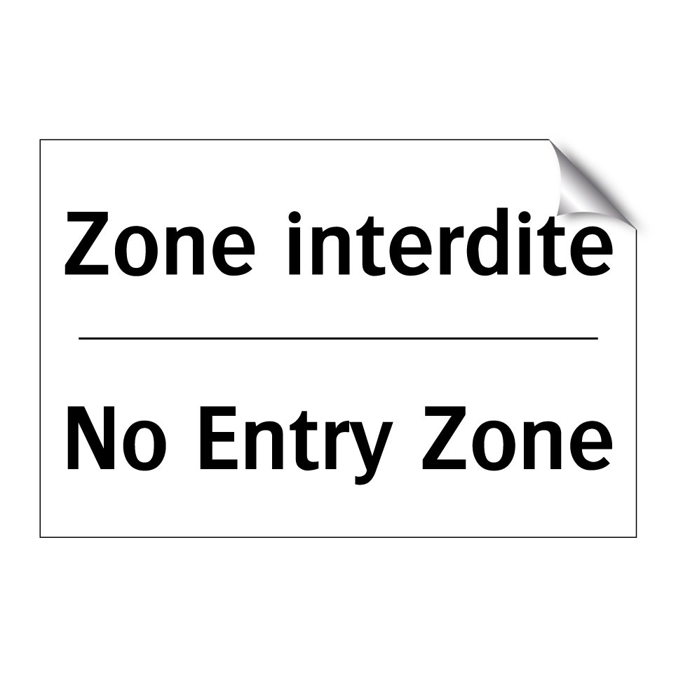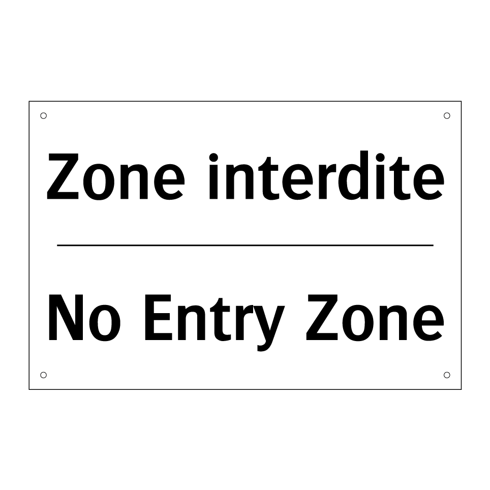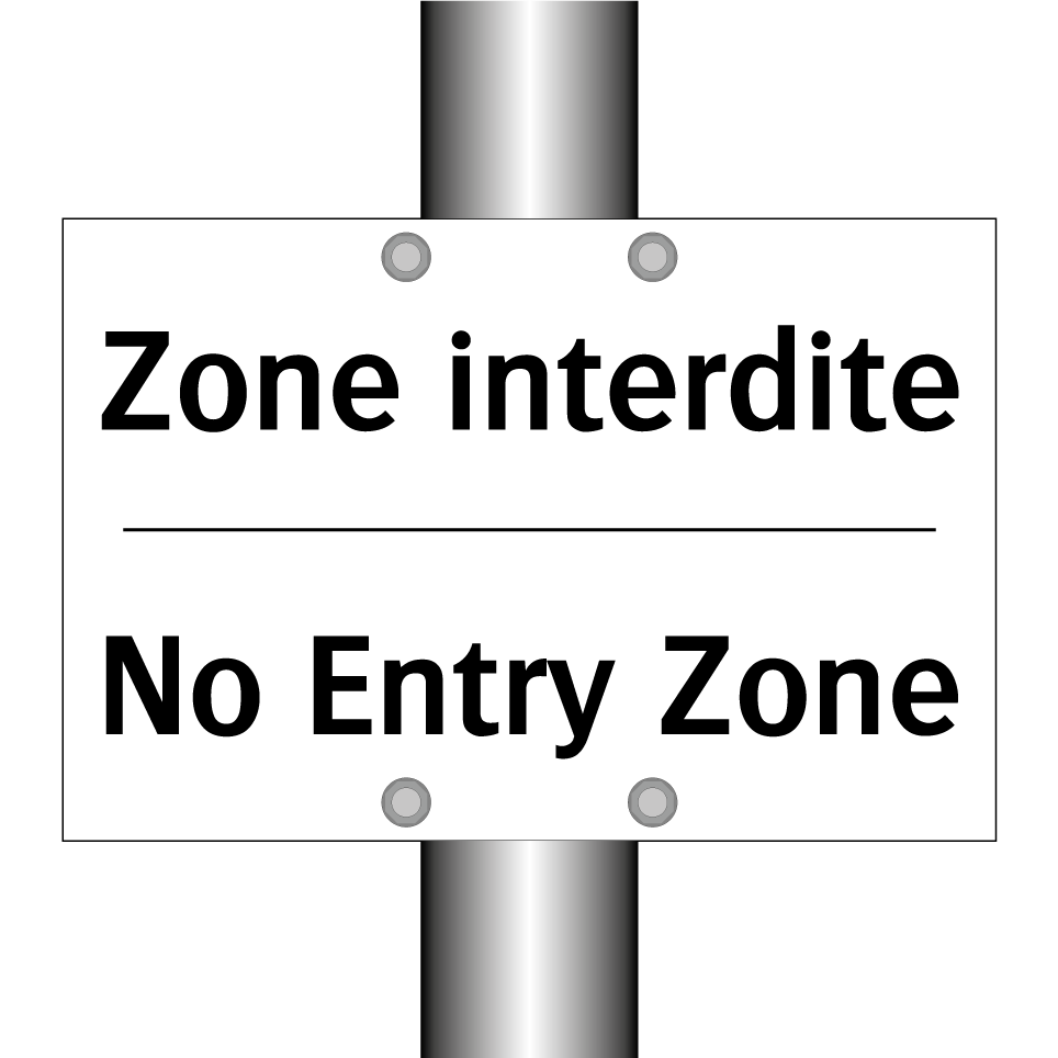 Panneau d'interdiction bilingue avec texte en français : "Zone interdite", et en anglais : "No Entry Zone"
