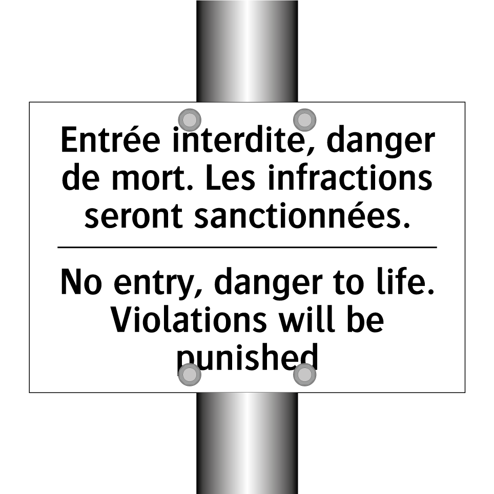 Panneau d'interdiction bilingue avec texte en français : "Entrée interdite, danger de mort. Les infractions seront sanctionnées.", et en anglais : "No entry, danger to life. Violations will be punished"