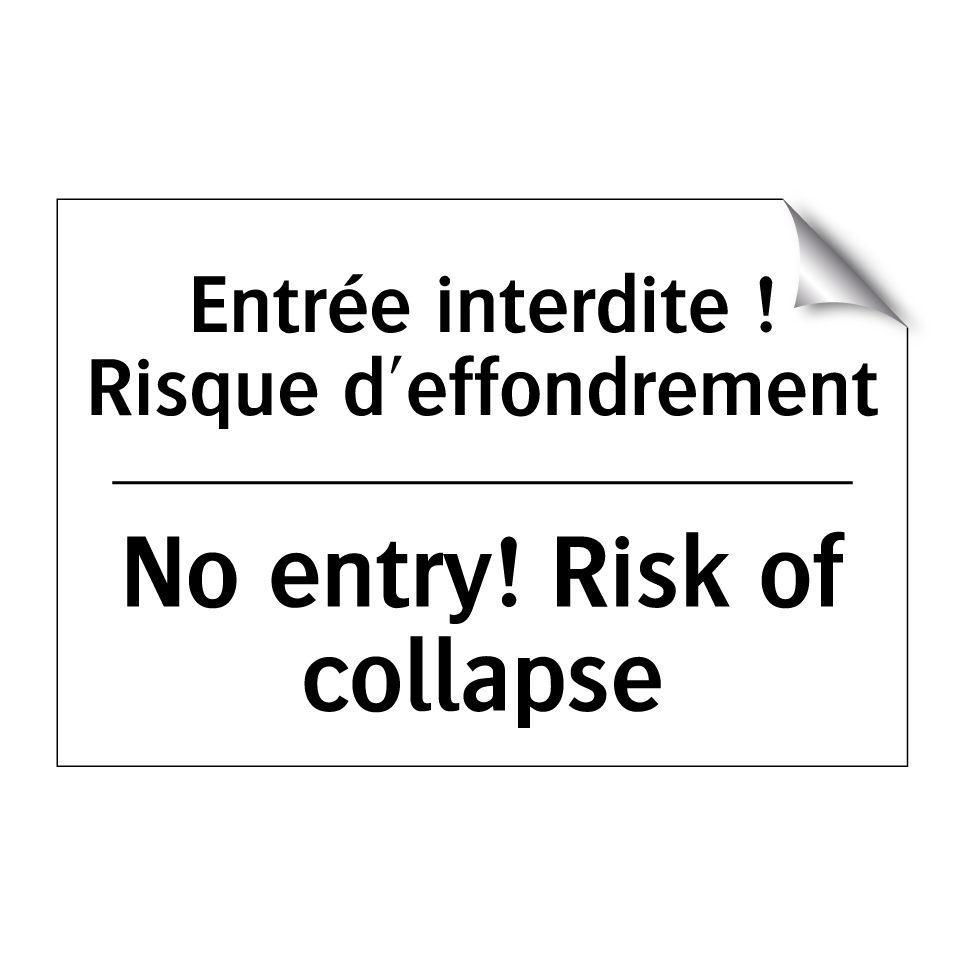 Panneau d'interdiction bilingue avec texte en français : "Entrée interdite ! Risque d'effondrement", et en anglais : "No entry! Risk of collapse"