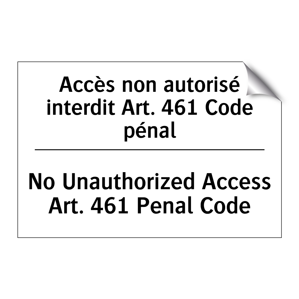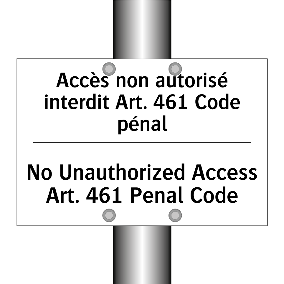 Panneau d'interdiction bilingue avec texte en français : "Accès non autorisé interdit Art. 461 Code pénal", et en anglais : "No Unauthorized Access Art. 461 Penal Code"