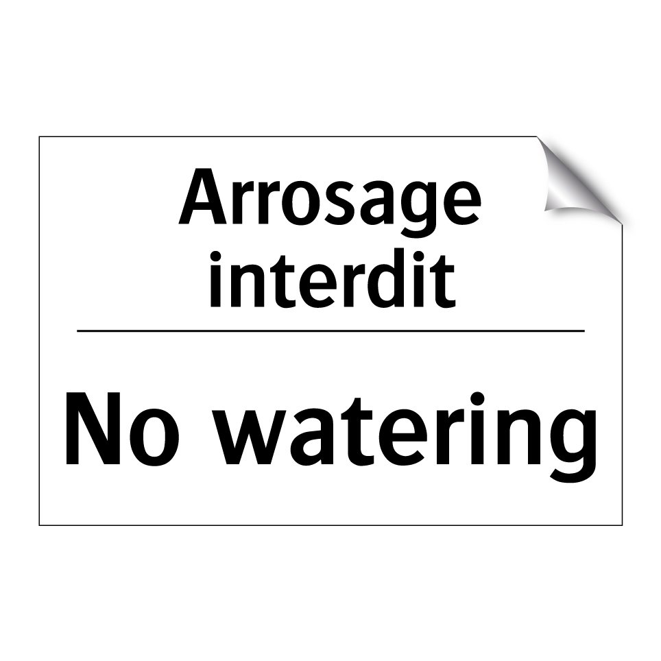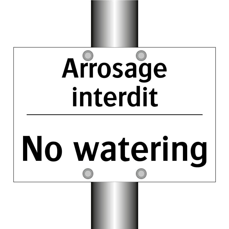 Panneau d'interdiction bilingue avec texte en français : "Arrosage interdit", et en anglais : "No watering"
