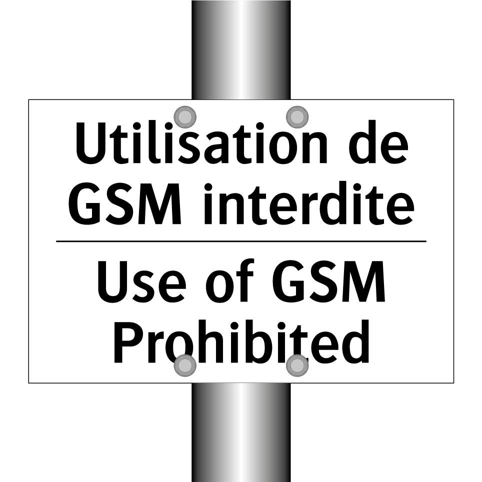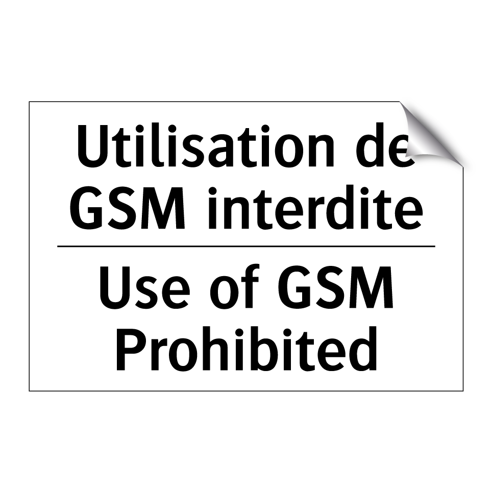 Panneau d'interdiction bilingue avec texte en français : "Utilisation de GSM interdite", et en anglais : "Use of GSM Prohibited"