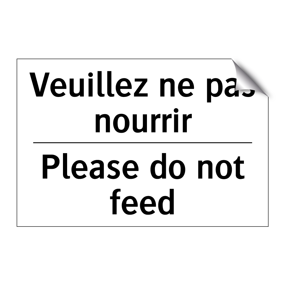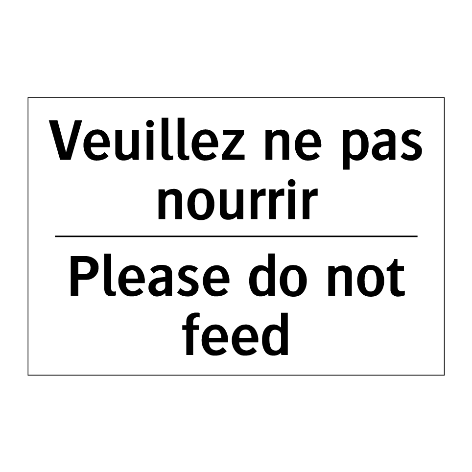 Panneau d'interdiction bilingue avec texte en français : "Veuillez ne pas nourrir", et en anglais : "Please do not feed"