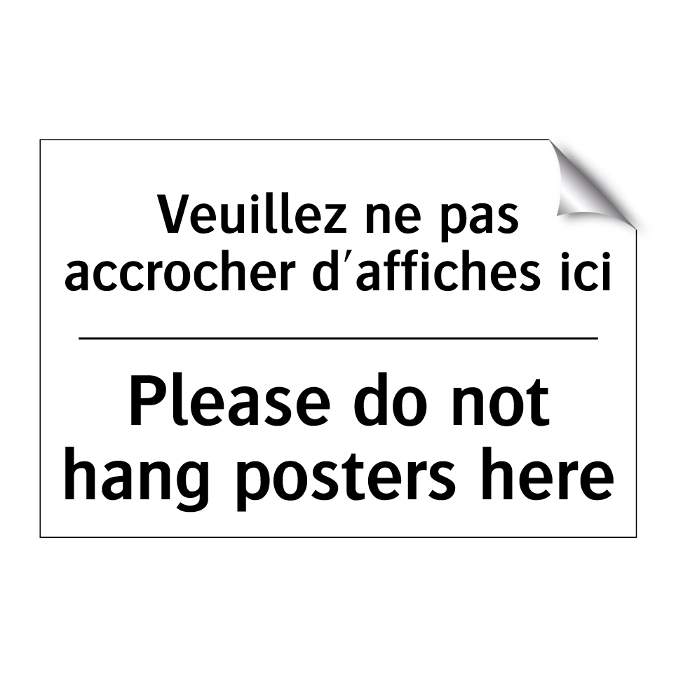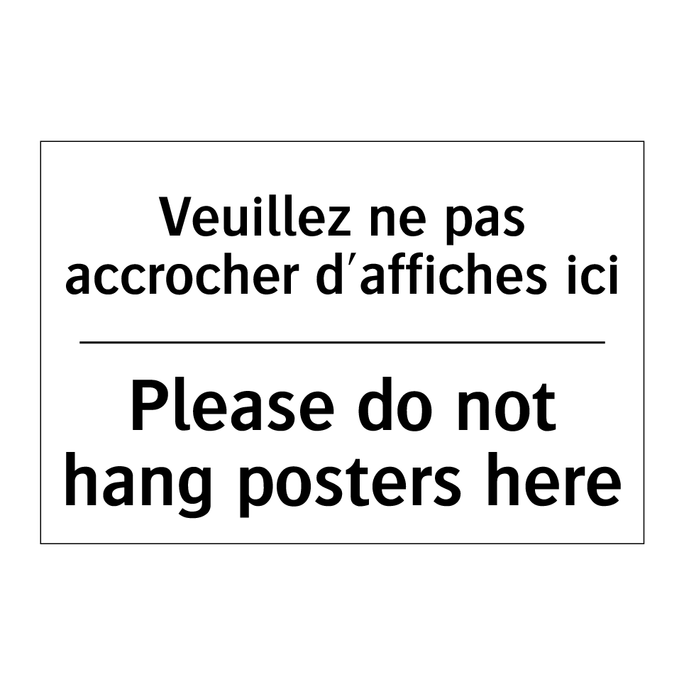 Panneau d'interdiction bilingue avec texte en français : "Veuillez ne pas accrocher d'affiches ici", et en anglais : "Please do not hang posters here"