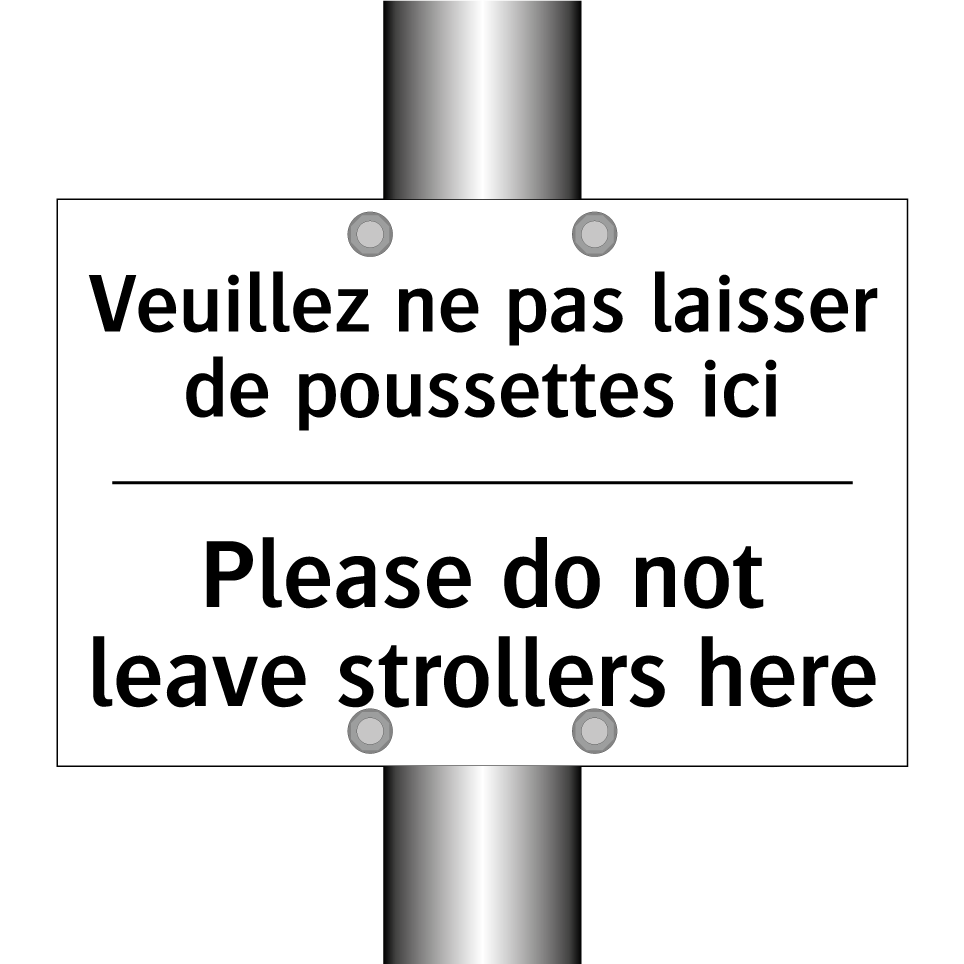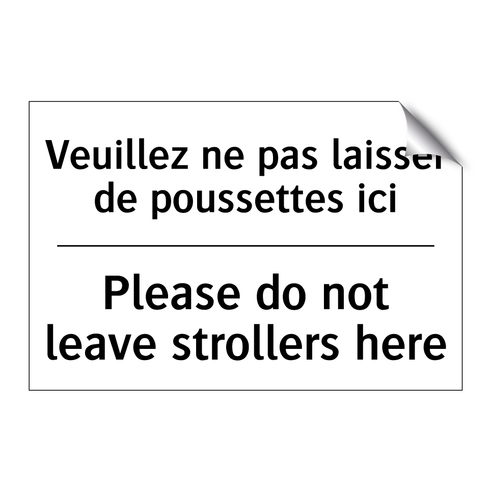 Panneau d'interdiction bilingue avec texte en français : "Veuillez ne pas laisser de poussettes ici", et en anglais : "Please do not leave strollers here"