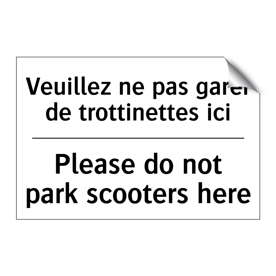 Panneau d'interdiction bilingue avec texte en français : "Veuillez ne pas garer de trottinettes ici", et en anglais : "Please do not park scooters here"