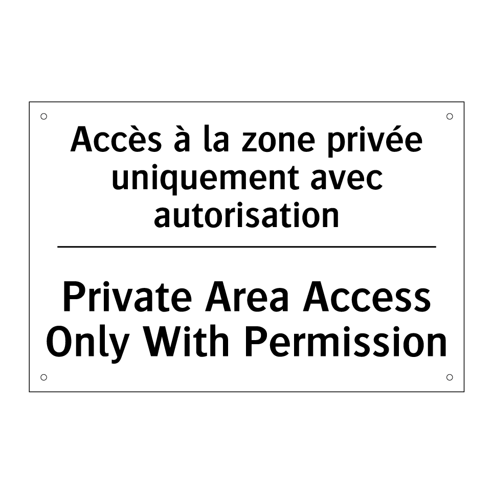 Panneau d'interdiction bilingue avec texte en français : "Accès à la zone privée uniquement avec autorisation", et en anglais : "Private Area Access Only With Permission"