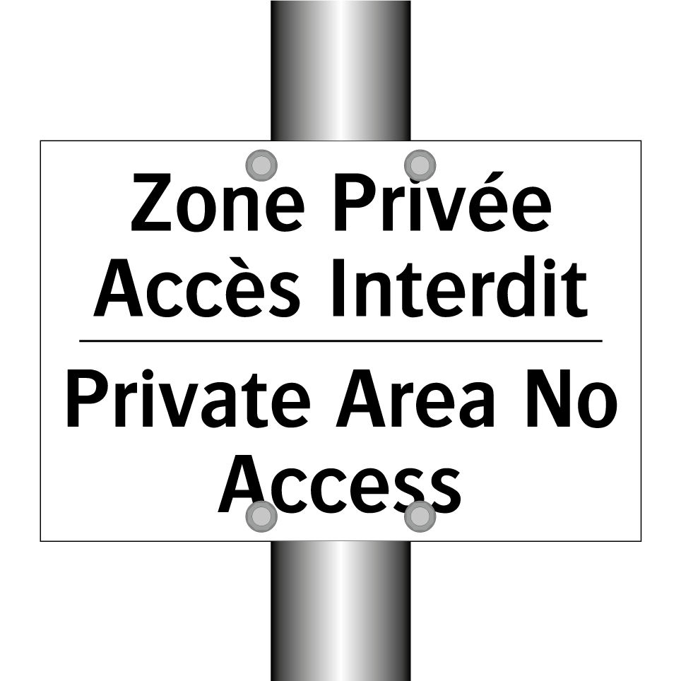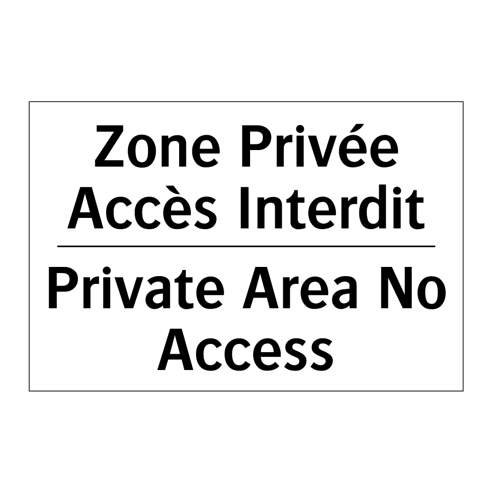 Panneau d'interdiction bilingue avec texte en français : "Zone Privée Accès Interdit", et en anglais : "Private Area No Access"