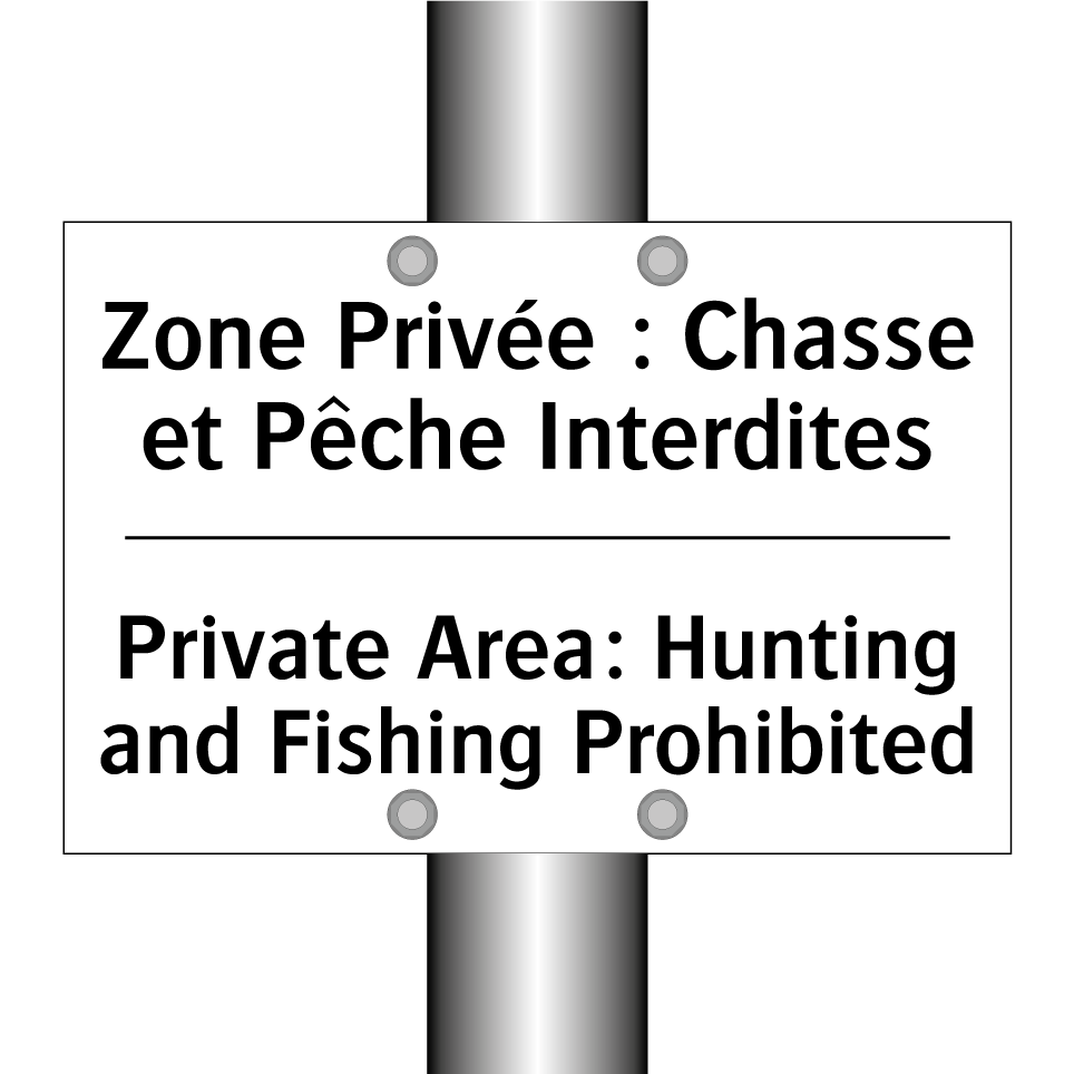 Panneau d'interdiction bilingue avec texte en français : "Zone Privée : Chasse et Pêche Interdites", et en anglais : "Private Area: Hunting and Fishing Prohibited"