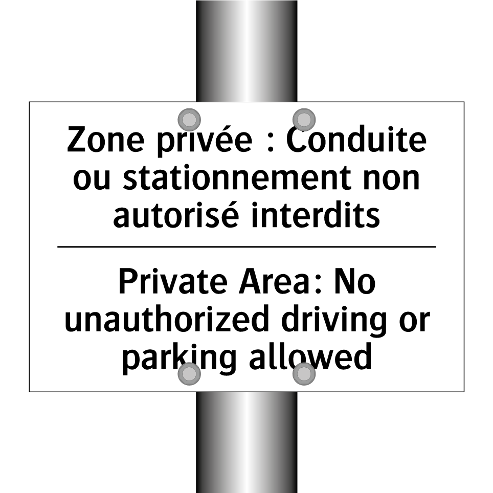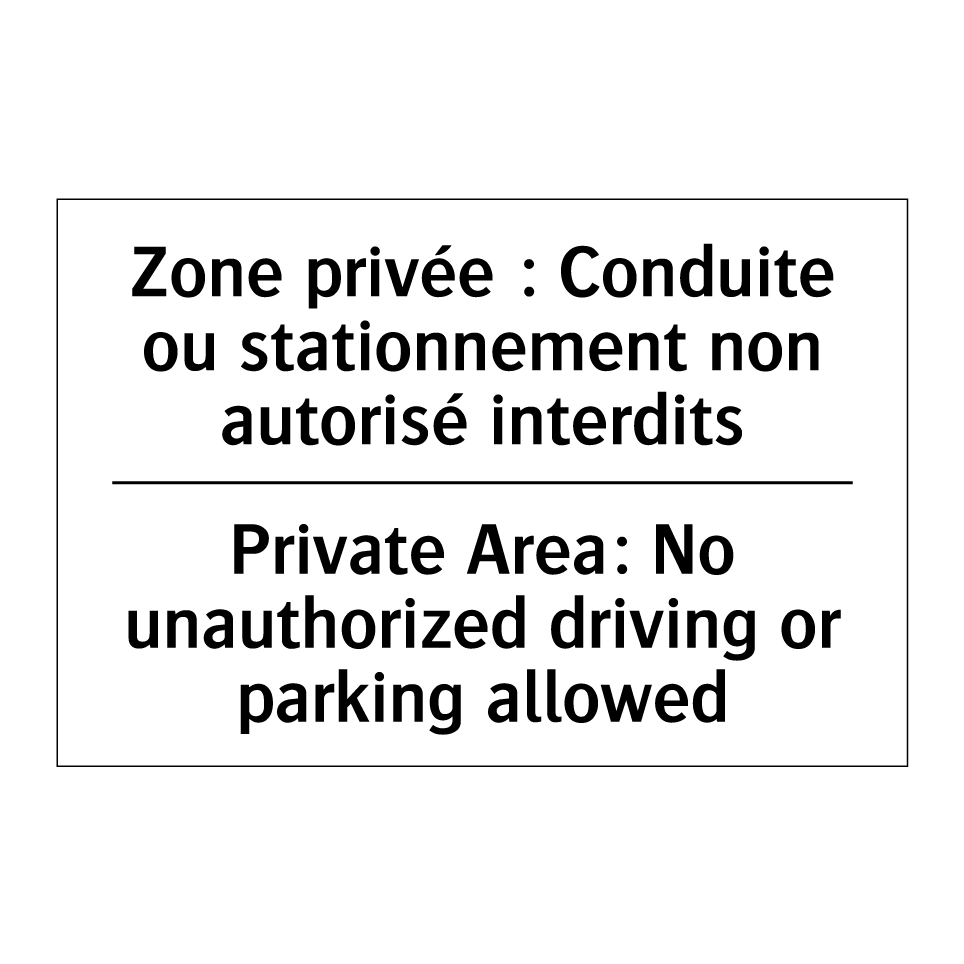 Panneau d'interdiction bilingue avec texte en français : "Zone privée : Conduite ou stationnement non autorisé interdits", et en anglais : "Private Area: No unauthorized driving or parking allowed"